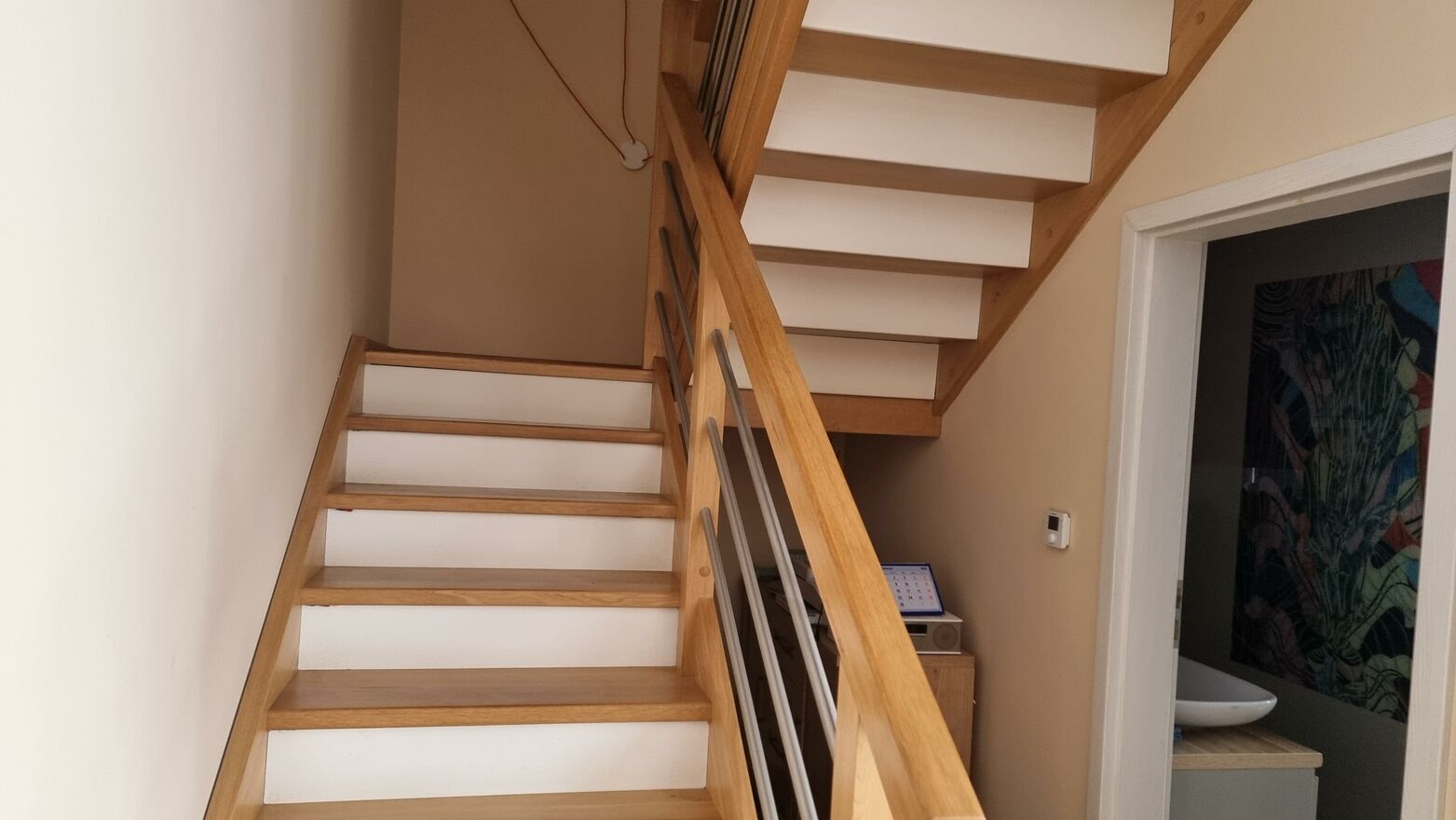 Z salonu na piętro prowadzą dębowe schody,